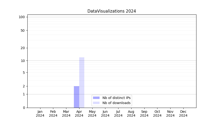 Number of downloads for experiment package DataVisualizations, year by year, from 2025 back to 2014 (years with no downloads are omitted):