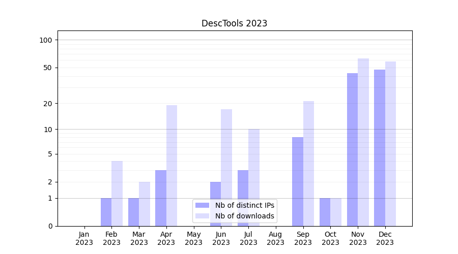 Number of downloads for experiment package DescTools, year by year, from 2025 back to 2014 (years with no downloads are omitted):
