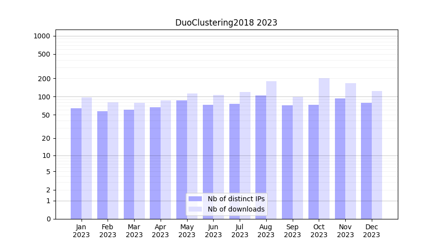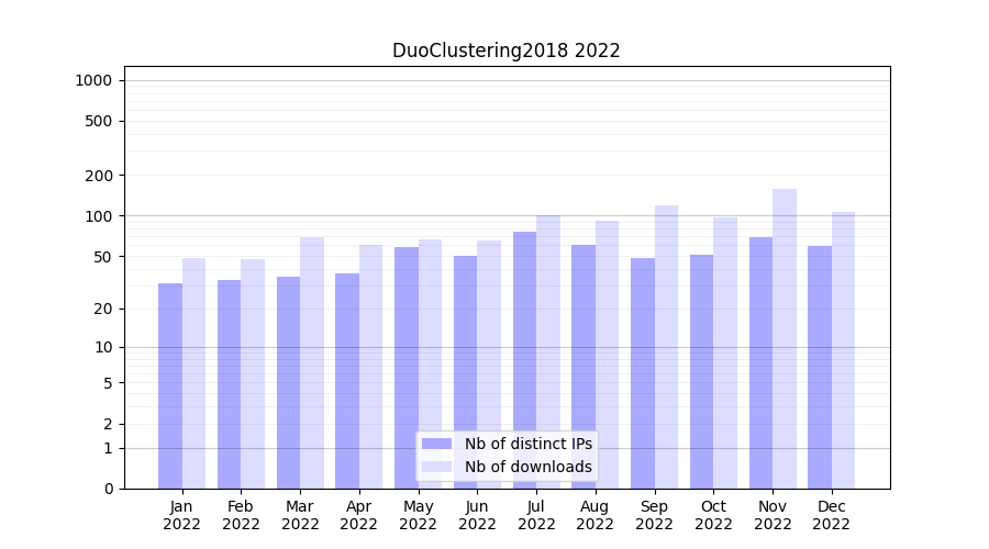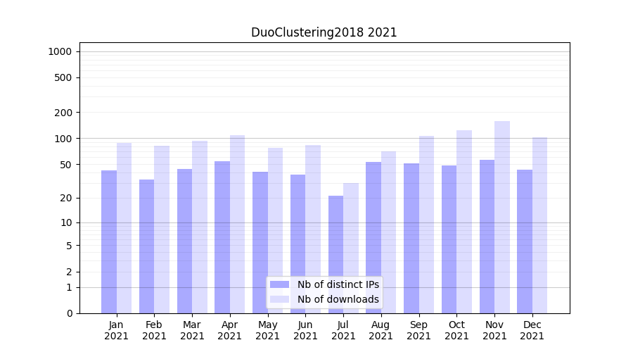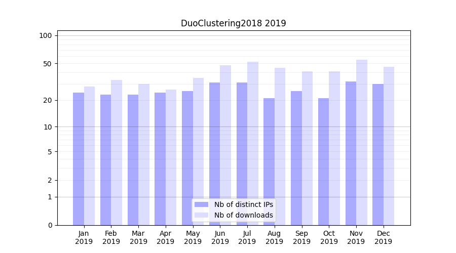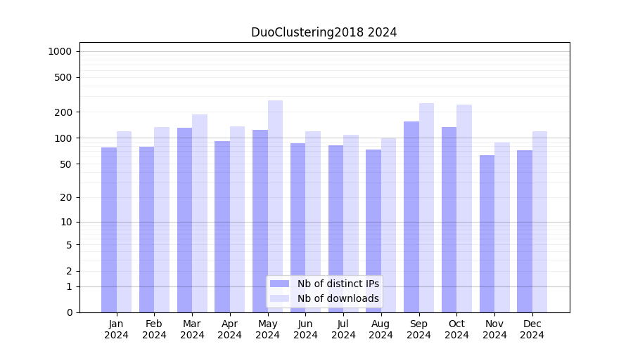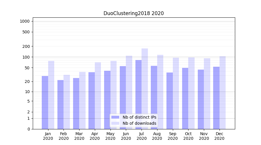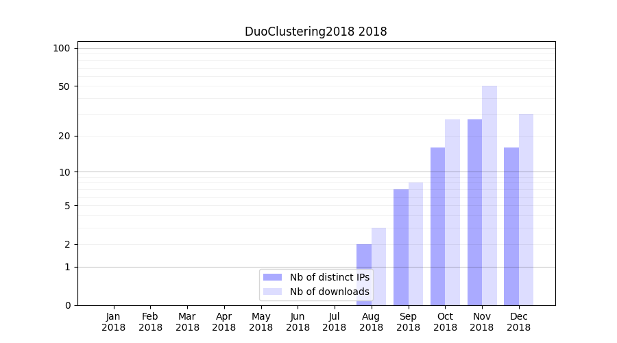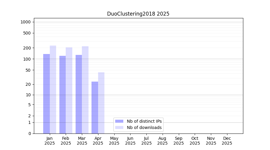 Number of downloads for experiment package DuoClustering2018, year by year, from 2025 back to 2014 (years with no downloads are omitted):