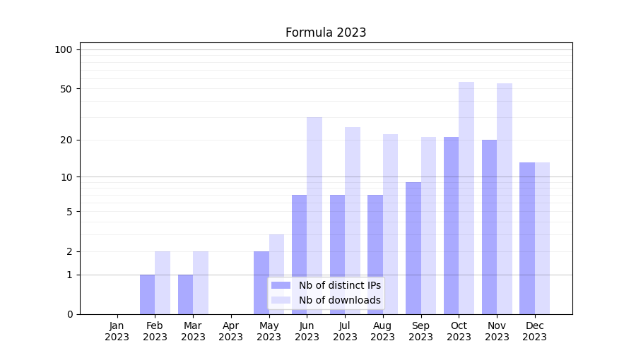 Number of downloads for experiment package Formula, year by year, from 2025 back to 2014 (years with no downloads are omitted):