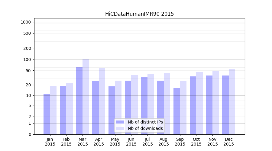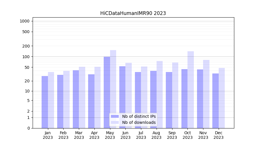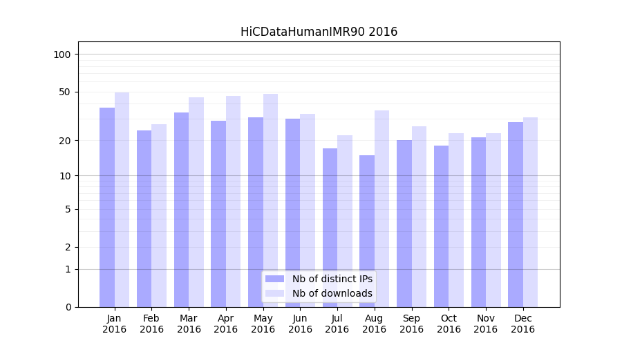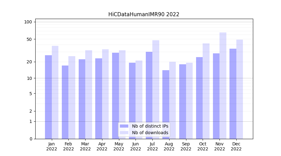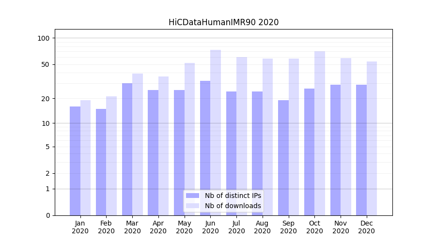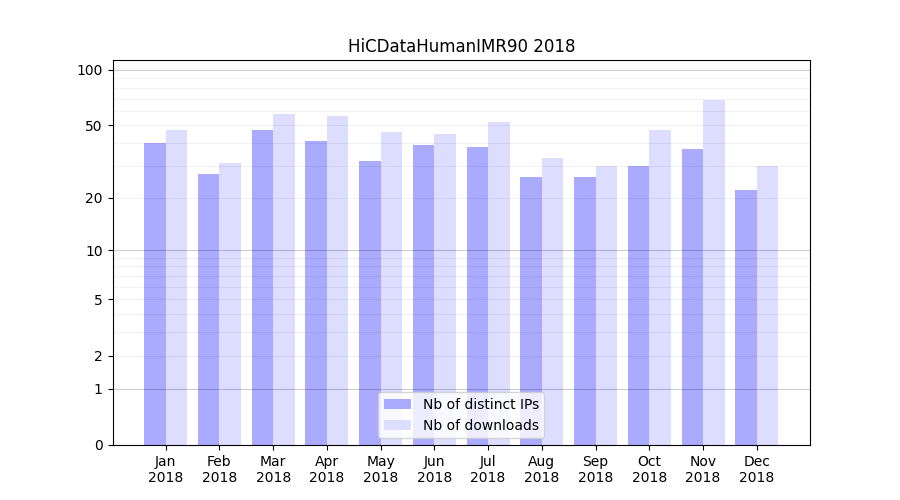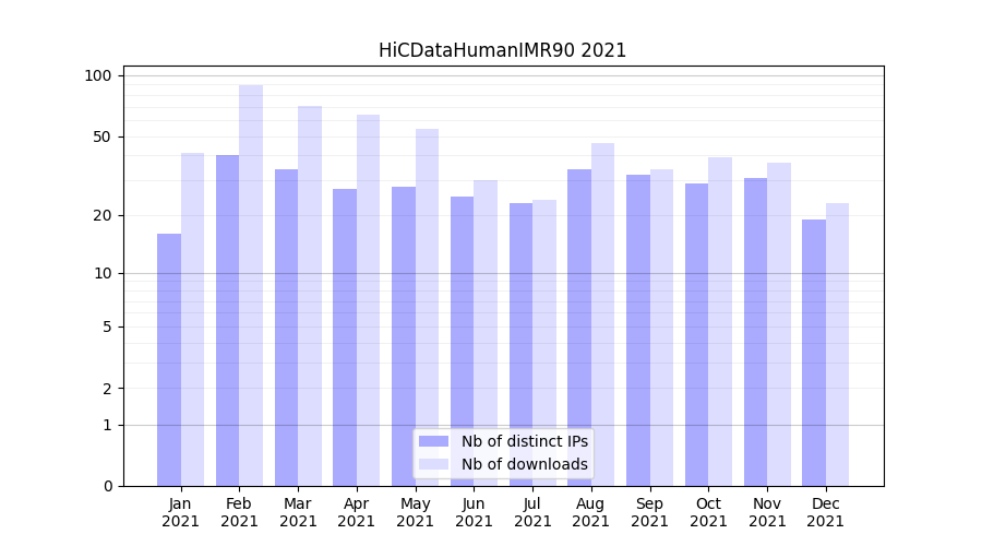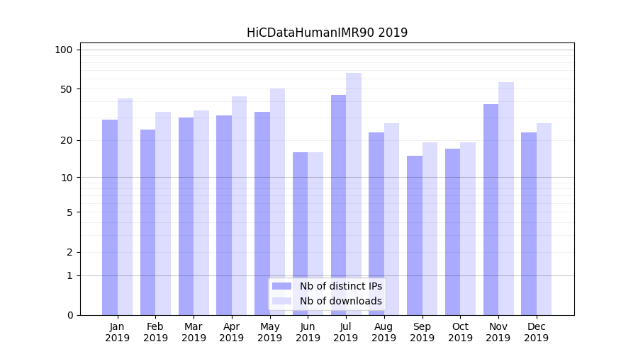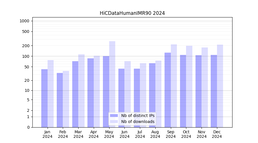Number of downloads for experiment package HiCDataHumanIMR90, year by year, from 2025 back to 2014 (years with no downloads are omitted):