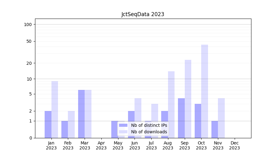 Number of downloads for experiment package JctSeqData, year by year, from 2025 back to 2014 (years with no downloads are omitted):