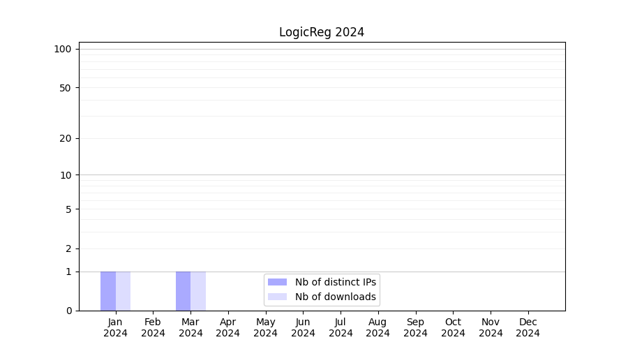 Number of downloads for experiment package LogicReg, year by year, from 2025 back to 2014 (years with no downloads are omitted):