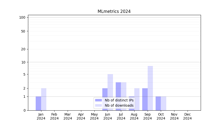 Number of downloads for experiment package MLmetrics, year by year, from 2025 back to 2014 (years with no downloads are omitted):