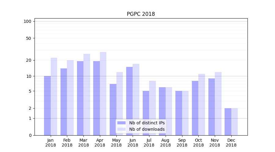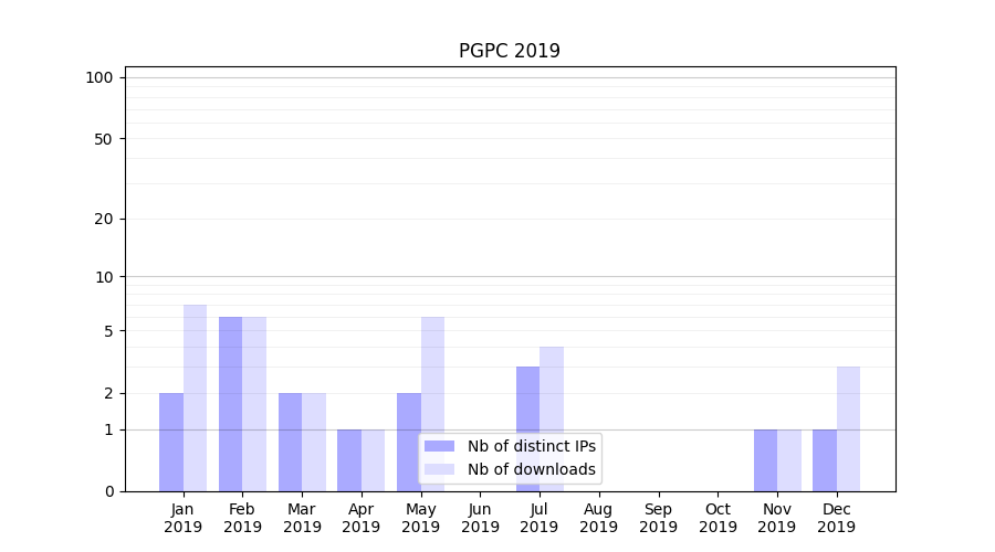 Number of downloads for experiment package PGPC, year by year, from 2025 back to 2014 (years with no downloads are omitted):