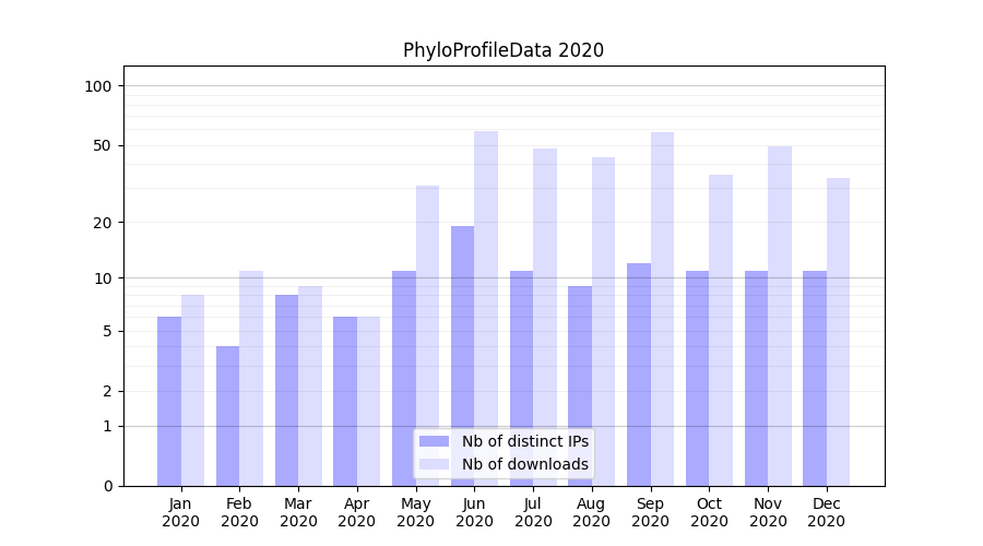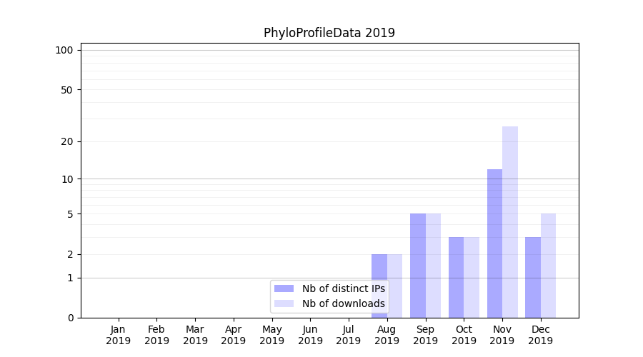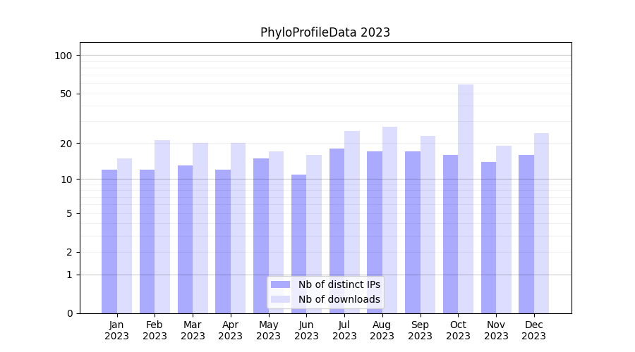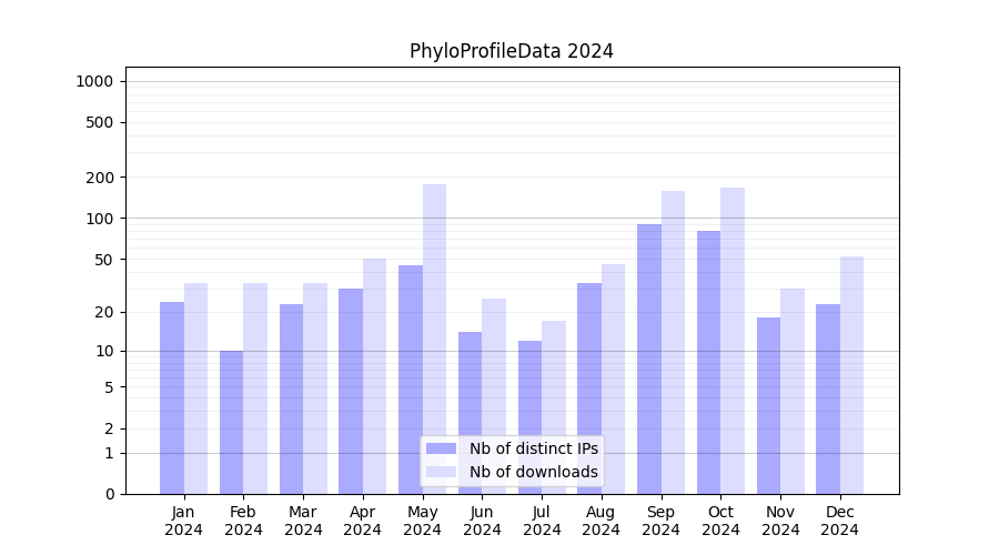 Number of downloads for experiment package PhyloProfileData, year by year, from 2025 back to 2014 (years with no downloads are omitted):