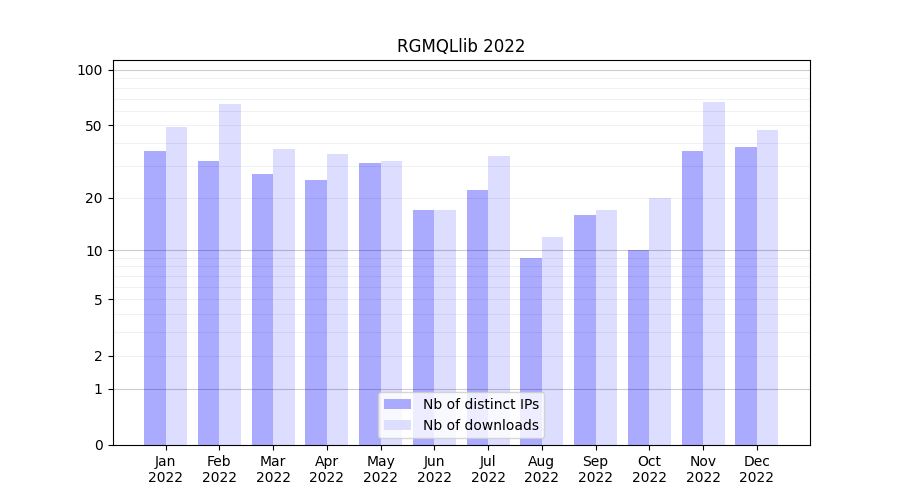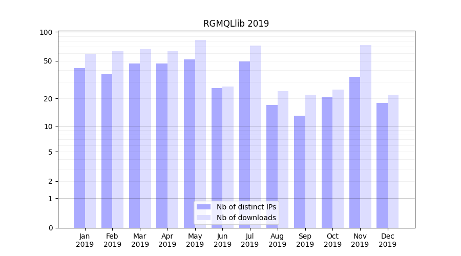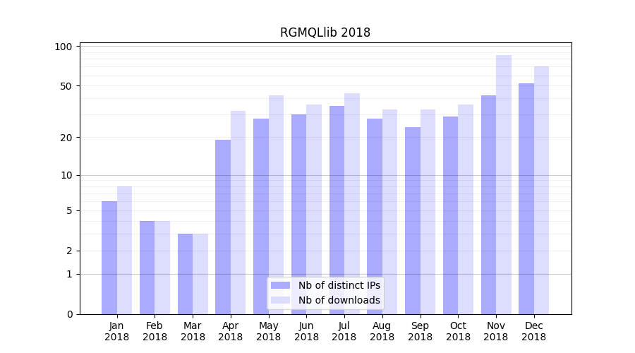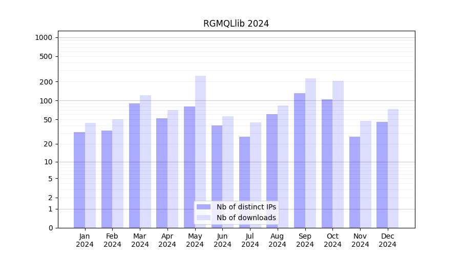 Number of downloads for experiment package RGMQLlib, year by year, from 2025 back to 2014 (years with no downloads are omitted):