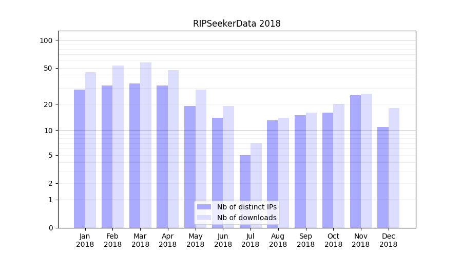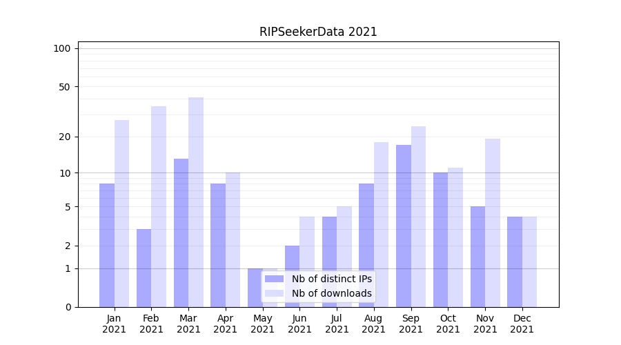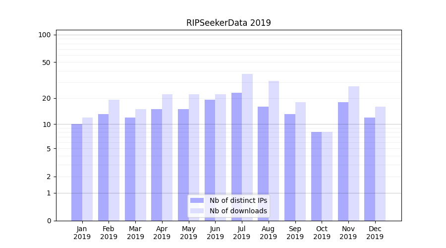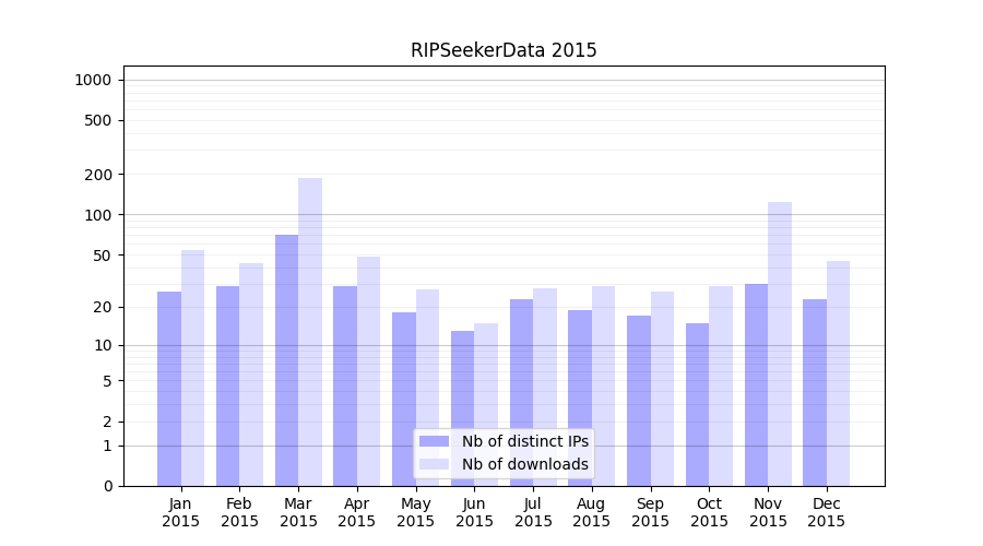 Number of downloads for experiment package RIPSeekerData, year by year, from 2025 back to 2014 (years with no downloads are omitted):