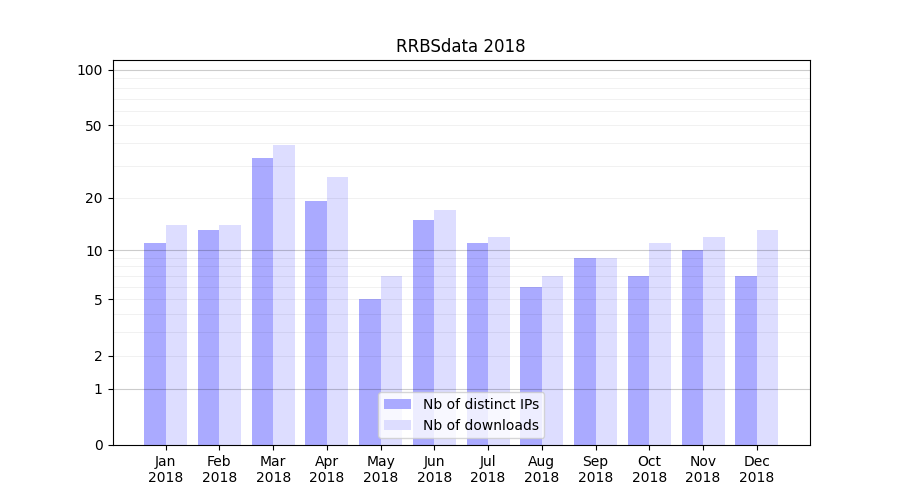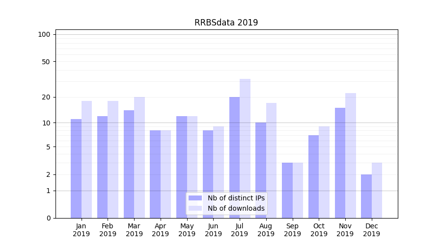 Number of downloads for experiment package RRBSdata, year by year, from 2025 back to 2014 (years with no downloads are omitted):