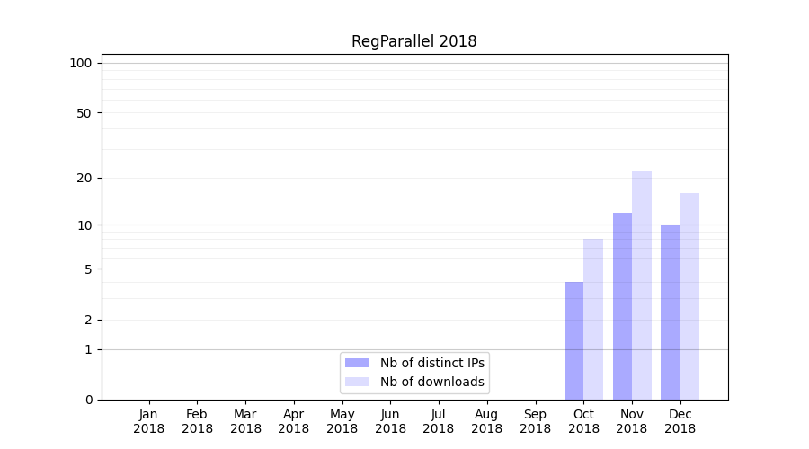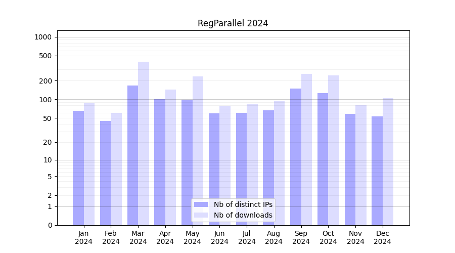 Number of downloads for experiment package RegParallel, year by year, from 2025 back to 2014 (years with no downloads are omitted):