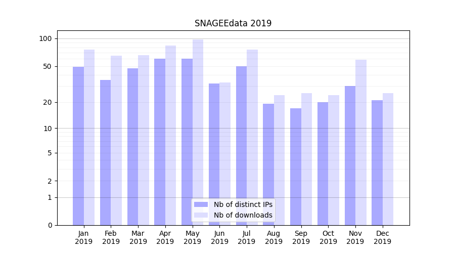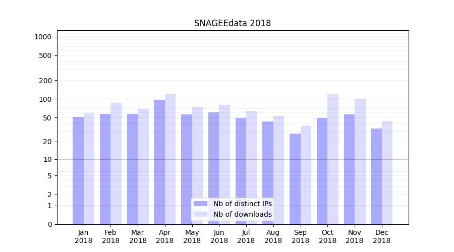 Number of downloads for experiment package SNAGEEdata, year by year, from 2025 back to 2014 (years with no downloads are omitted):