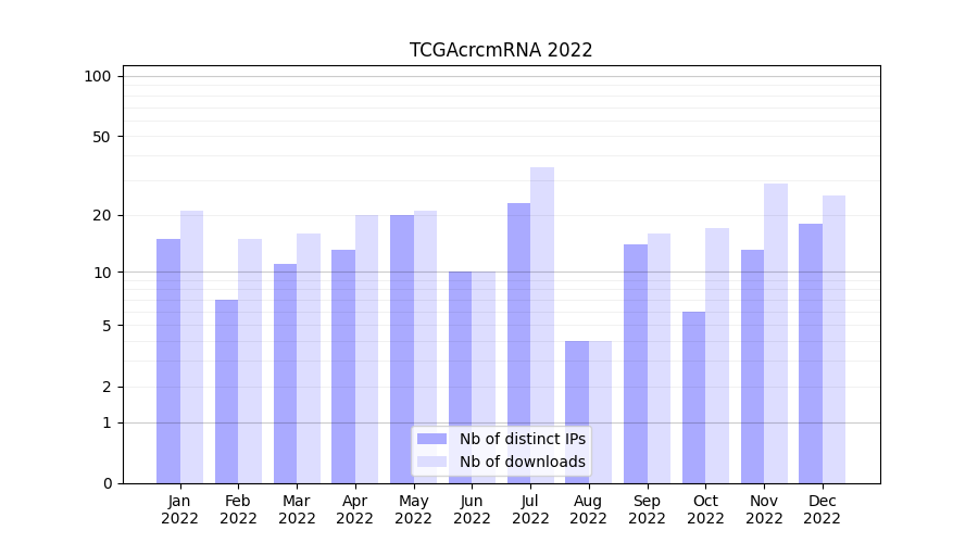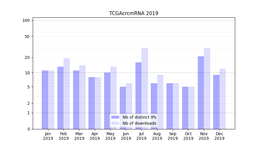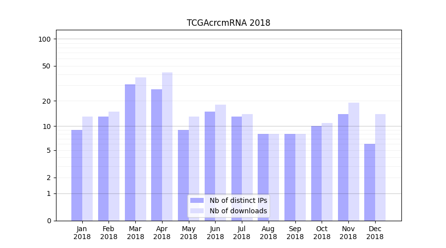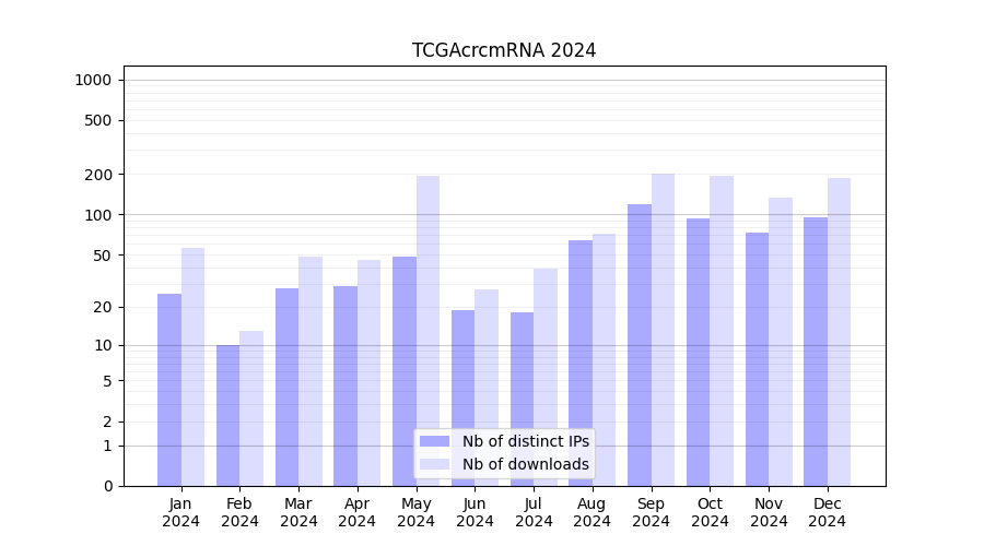 Number of downloads for experiment package TCGAcrcmRNA, year by year, from 2025 back to 2014 (years with no downloads are omitted):