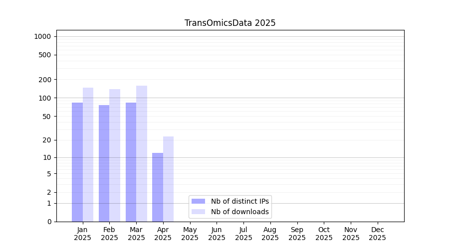 Number of downloads for experiment package TransOmicsData, year by year, from 2025 back to 2014 (years with no downloads are omitted):