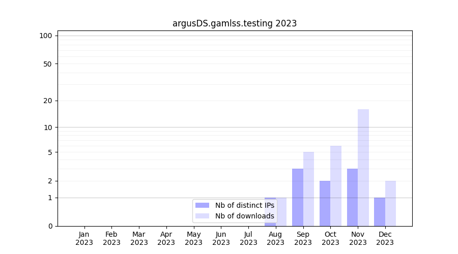 Number of downloads for experiment package argusDS.gamlss.testing, year by year, from 2025 back to 2014 (years with no downloads are omitted):