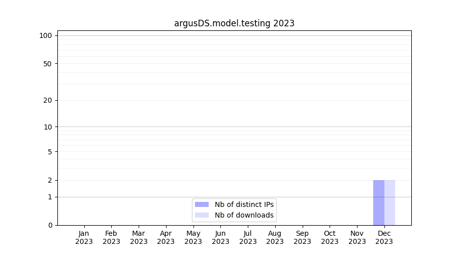 Number of downloads for experiment package argusDS.model.testing, year by year, from 2025 back to 2014 (years with no downloads are omitted):