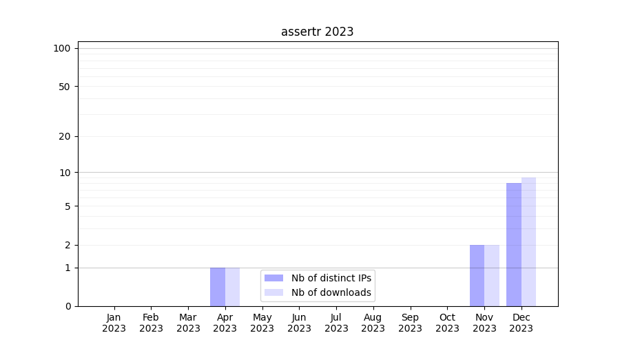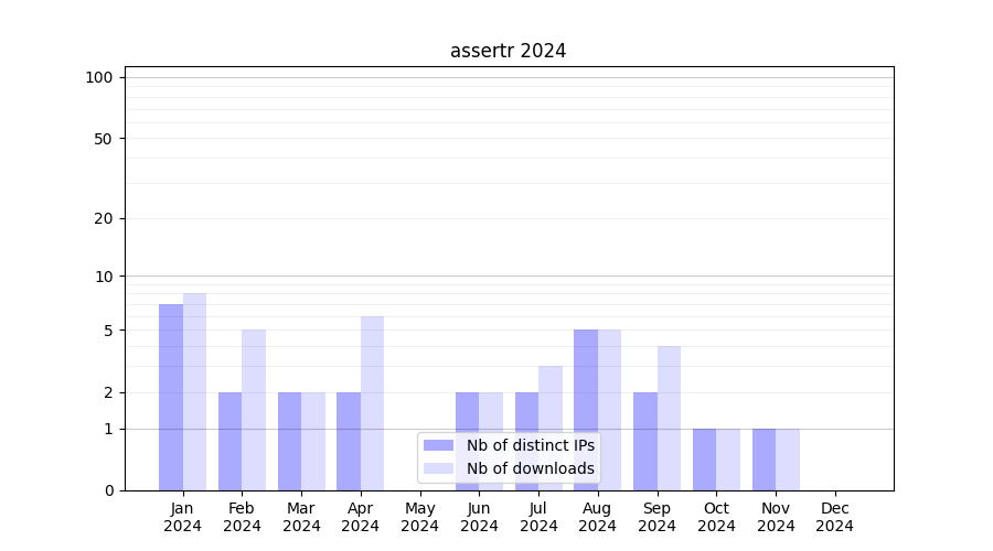 Number of downloads for experiment package assertr, year by year, from 2025 back to 2014 (years with no downloads are omitted):