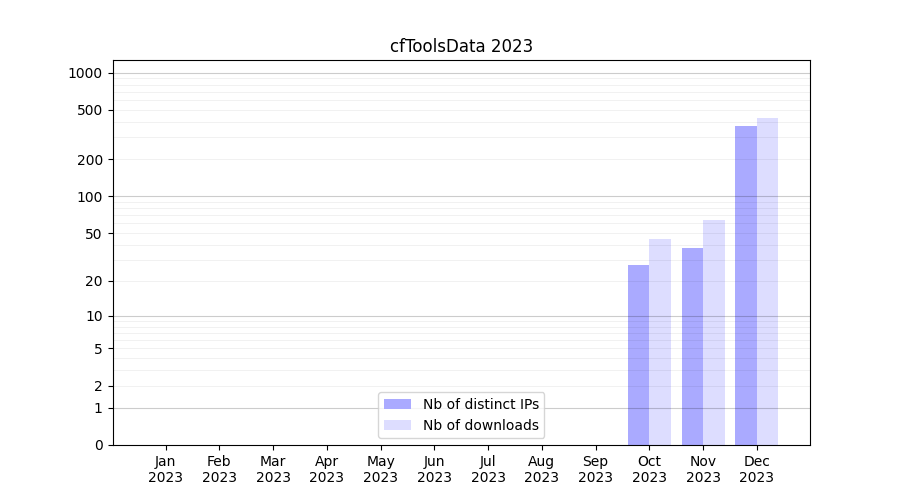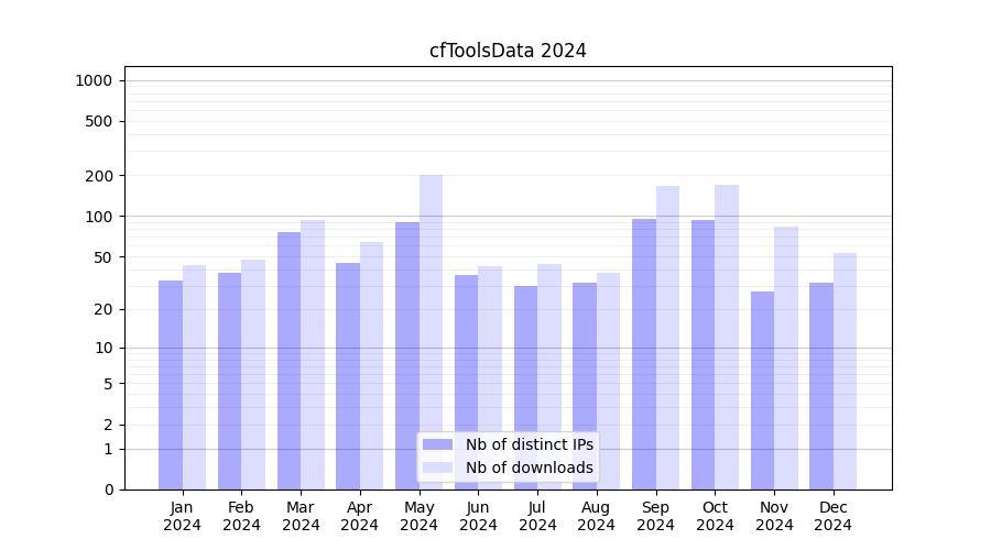 Number of downloads for experiment package cfToolsData, year by year, from 2025 back to 2014 (years with no downloads are omitted):