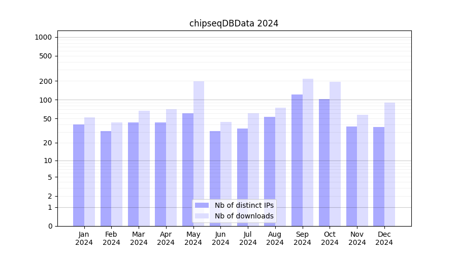 Number of downloads for experiment package chipseqDBData, year by year, from 2025 back to 2014 (years with no downloads are omitted):