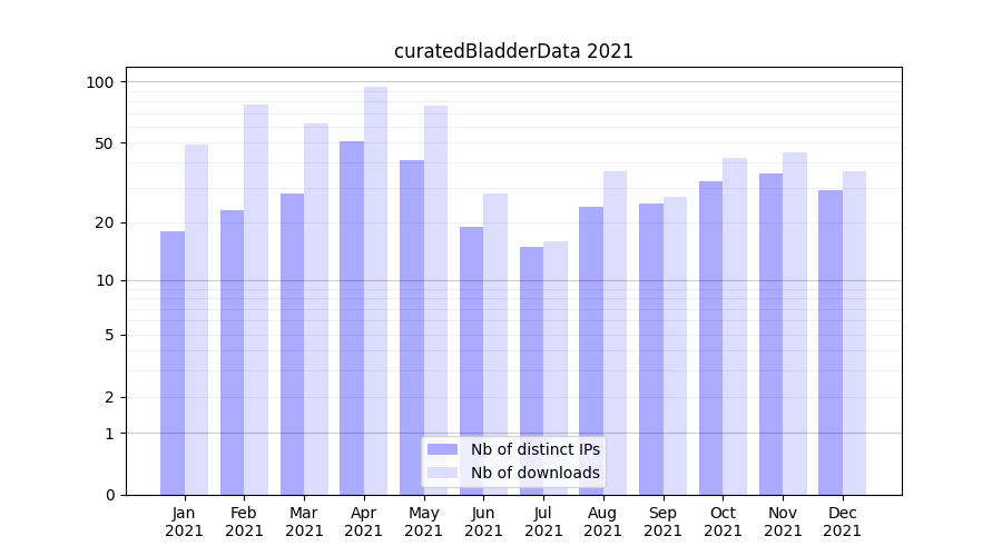 Number of downloads for experiment package curatedBladderData, year by year, from 2025 back to 2014 (years with no downloads are omitted):