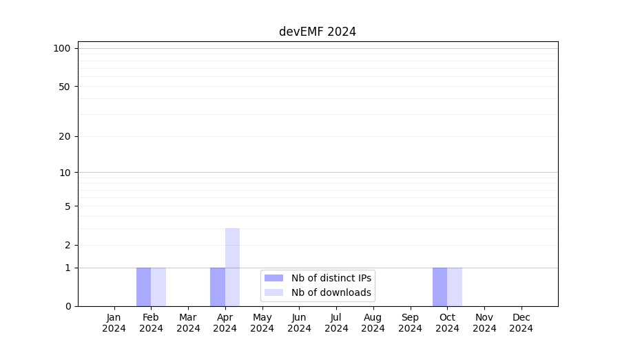 Number of downloads for experiment package devEMF, year by year, from 2025 back to 2014 (years with no downloads are omitted):