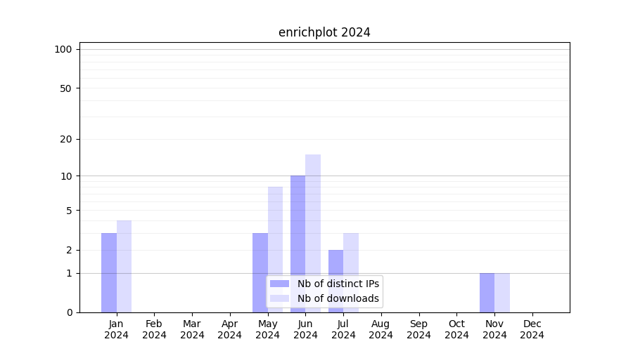 Number of downloads for experiment package enrichplot, year by year, from 2025 back to 2014 (years with no downloads are omitted):