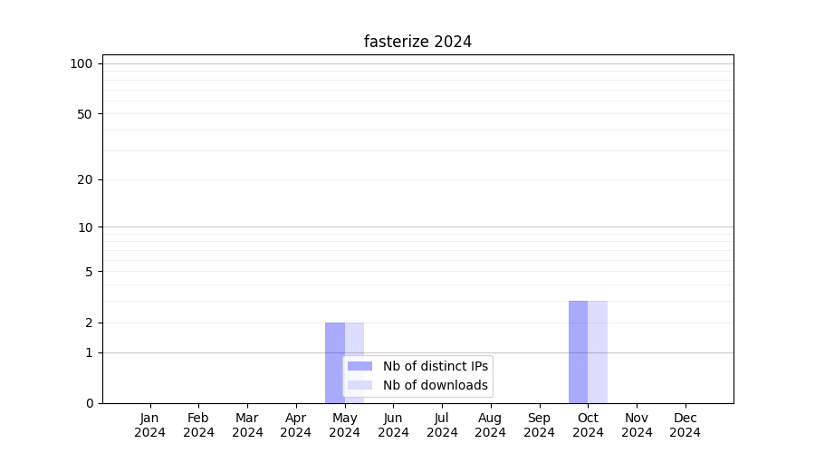 Number of downloads for experiment package fasterize, year by year, from 2025 back to 2014 (years with no downloads are omitted):