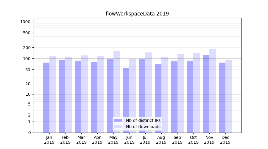 Number of downloads for experiment package flowWorkspaceData, year by year, from 2025 back to 2014 (years with no downloads are omitted):