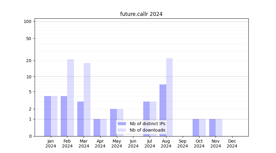 Number of downloads for experiment package future.callr, year by year, from 2025 back to 2014 (years with no downloads are omitted):