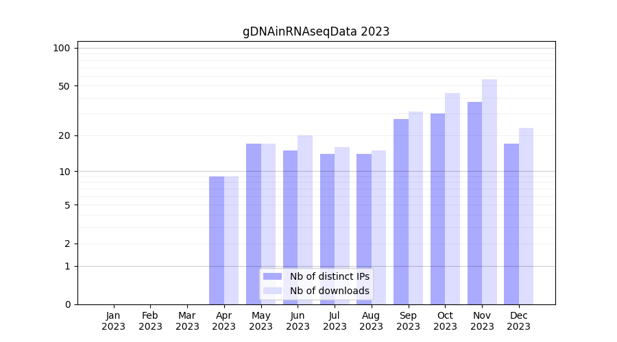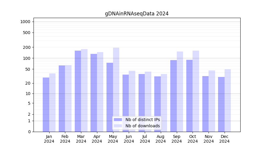 Number of downloads for experiment package gDNAinRNAseqData, year by year, from 2025 back to 2014 (years with no downloads are omitted):
