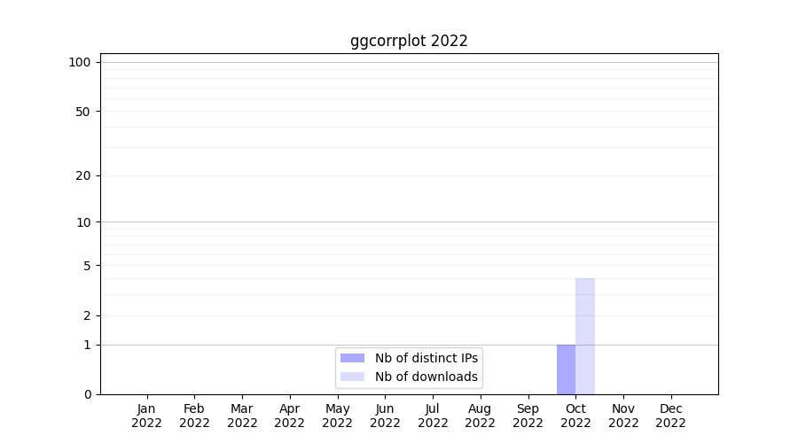 Number of downloads for experiment package ggcorrplot, year by year, from 2025 back to 2014 (years with no downloads are omitted):