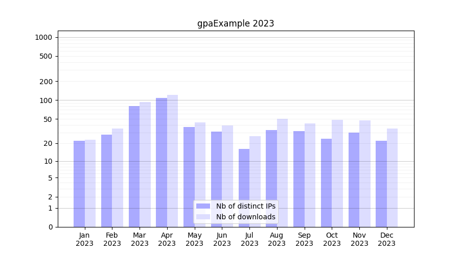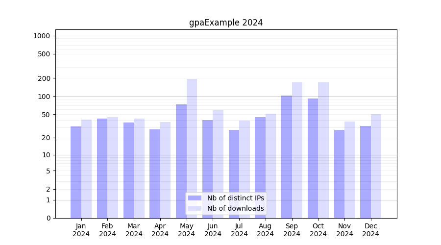 Number of downloads for experiment package gpaExample, year by year, from 2025 back to 2014 (years with no downloads are omitted):