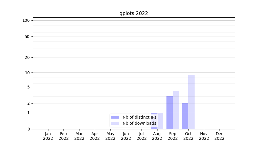 Number of downloads for experiment package gplots, year by year, from 2025 back to 2014 (years with no downloads are omitted):