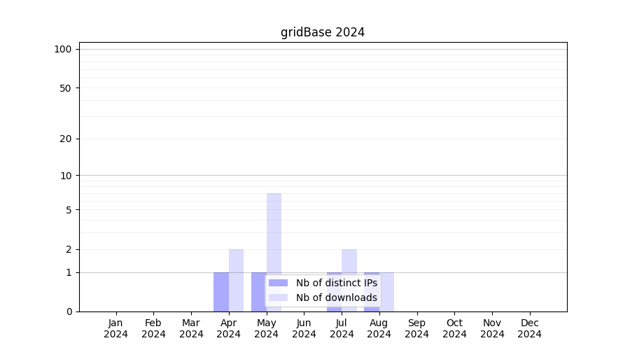 Number of downloads for experiment package gridBase, year by year, from 2025 back to 2014 (years with no downloads are omitted):