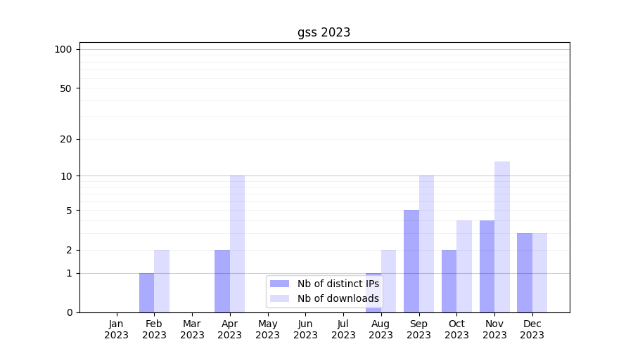 Number of downloads for experiment package gss, year by year, from 2025 back to 2014 (years with no downloads are omitted):