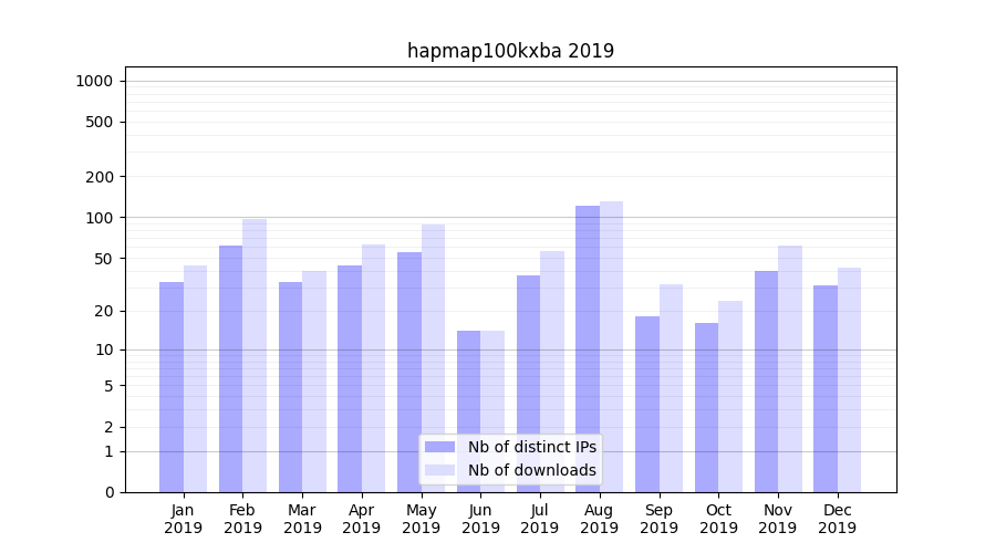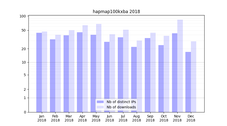 Number of downloads for experiment package hapmap100kxba, year by year, from 2025 back to 2014 (years with no downloads are omitted):