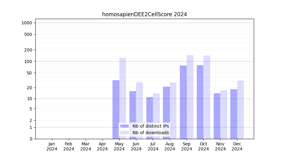 Number of downloads for experiment package homosapienDEE2CellScore, year by year, from 2025 back to 2014 (years with no downloads are omitted):