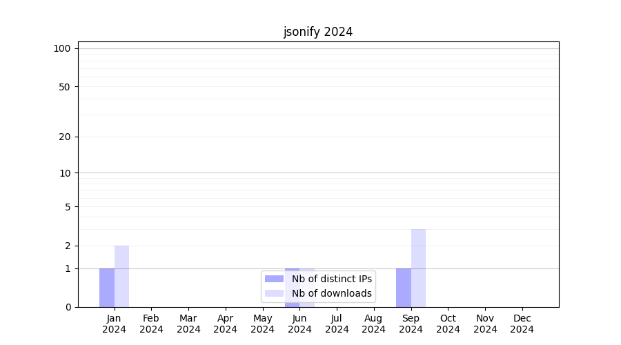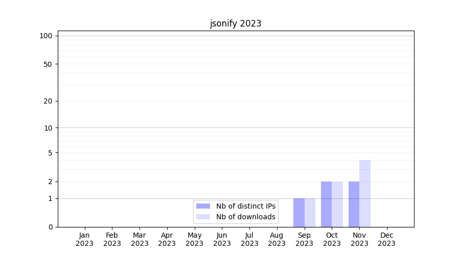 Number of downloads for experiment package jsonify, year by year, from 2025 back to 2014 (years with no downloads are omitted):