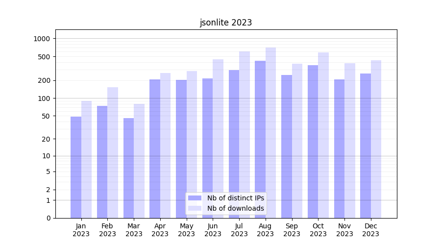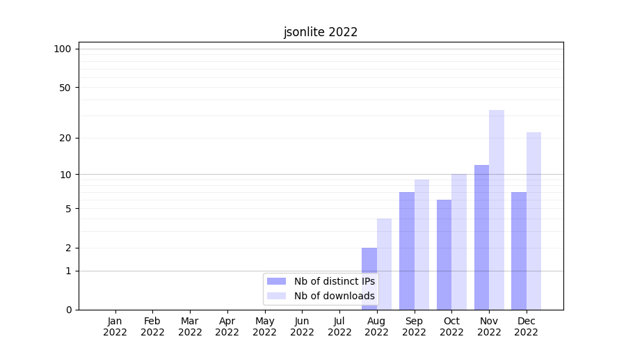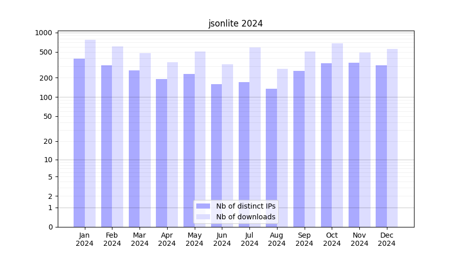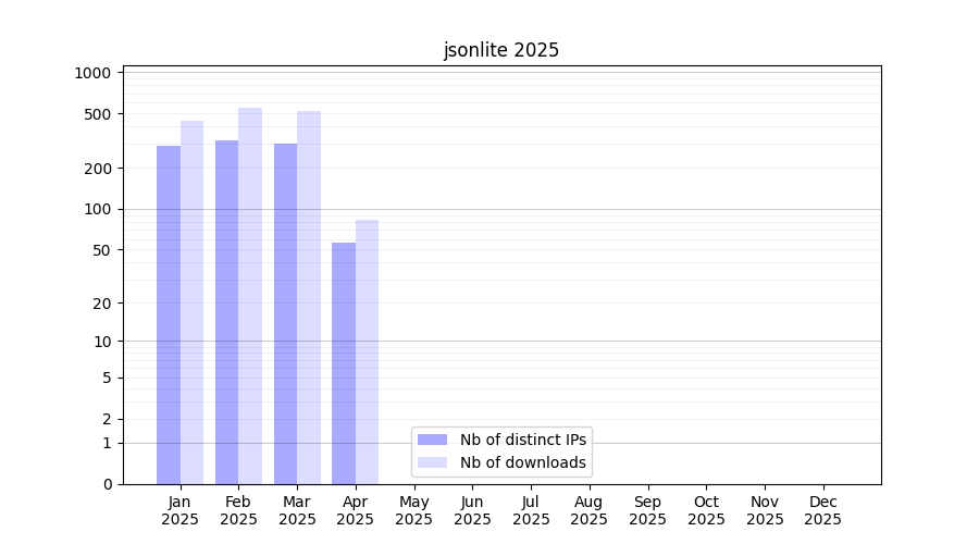Number of downloads for experiment package jsonlite, year by year, from 2025 back to 2014 (years with no downloads are omitted):