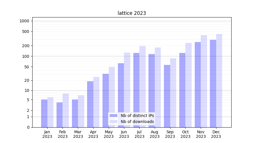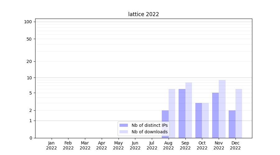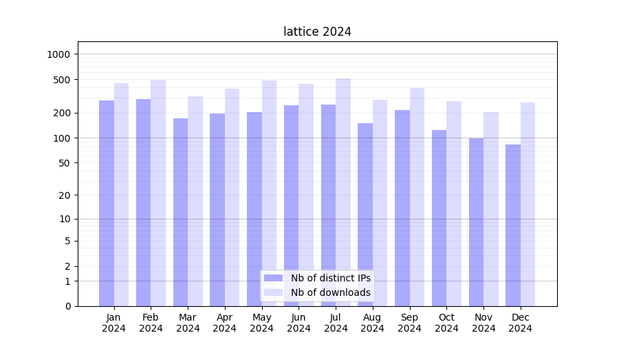 Number of downloads for experiment package lattice, year by year, from 2025 back to 2014 (years with no downloads are omitted):