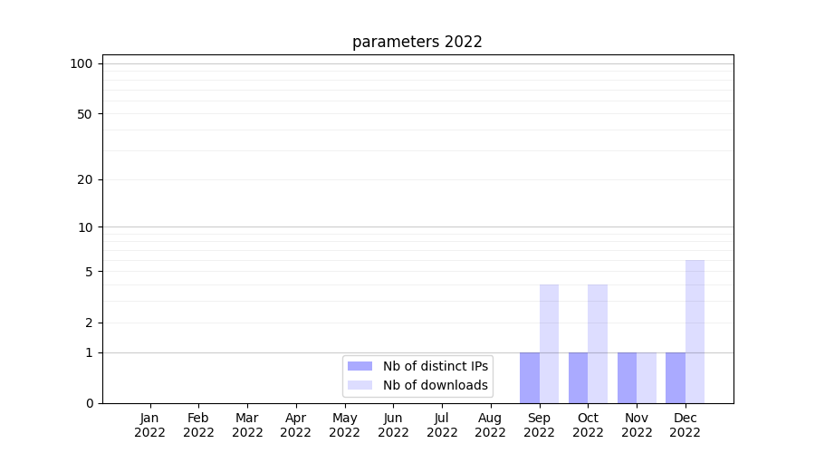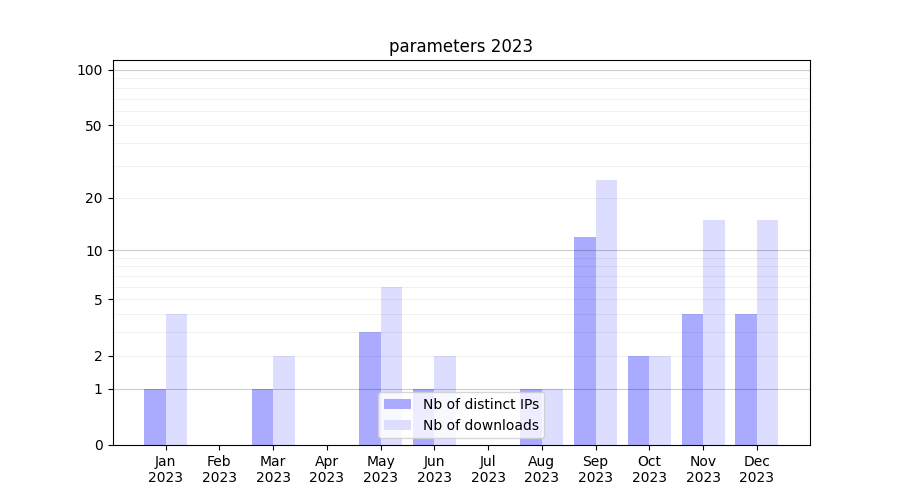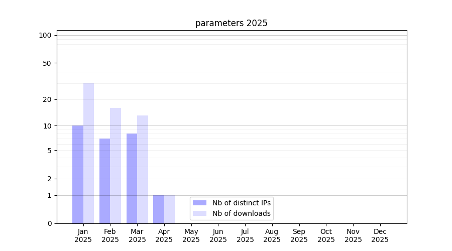 Number of downloads for experiment package parameters, year by year, from 2025 back to 2014 (years with no downloads are omitted):