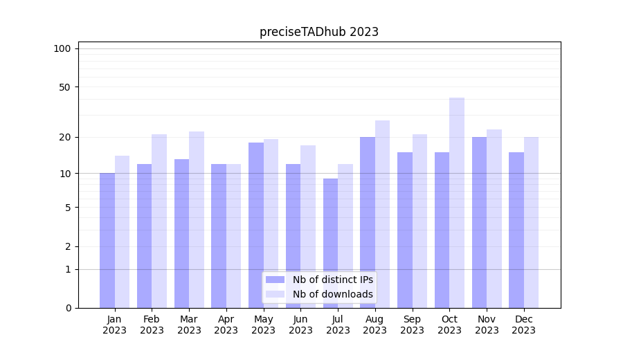 Number of downloads for experiment package preciseTADhub, year by year, from 2025 back to 2014 (years with no downloads are omitted):