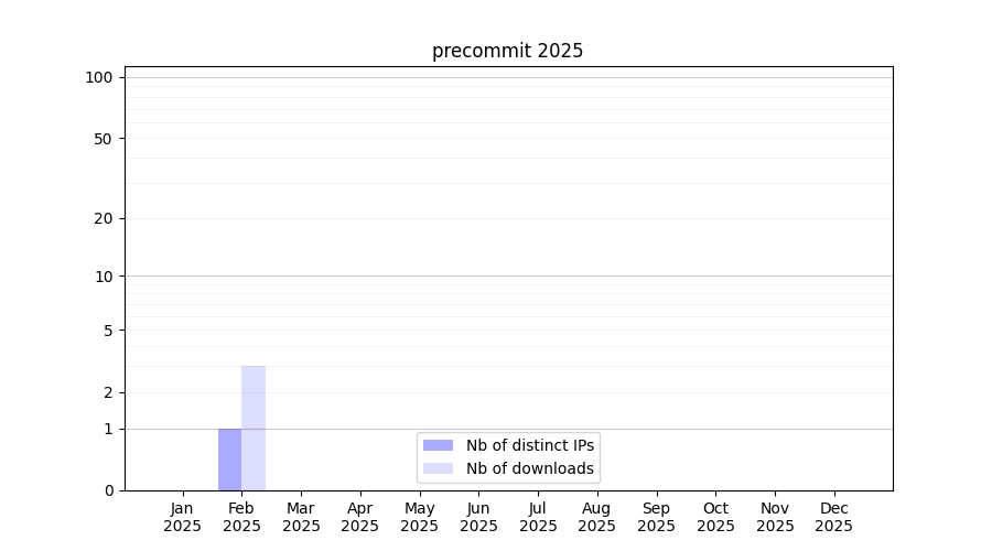 Number of downloads for experiment package precommit, year by year, from 2025 back to 2014 (years with no downloads are omitted):