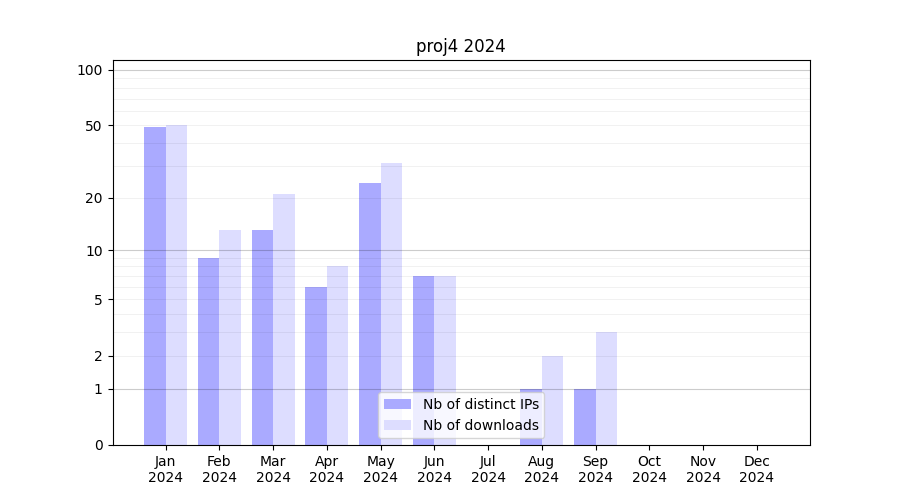 Number of downloads for experiment package proj4, year by year, from 2025 back to 2014 (years with no downloads are omitted):