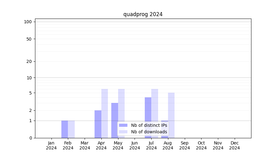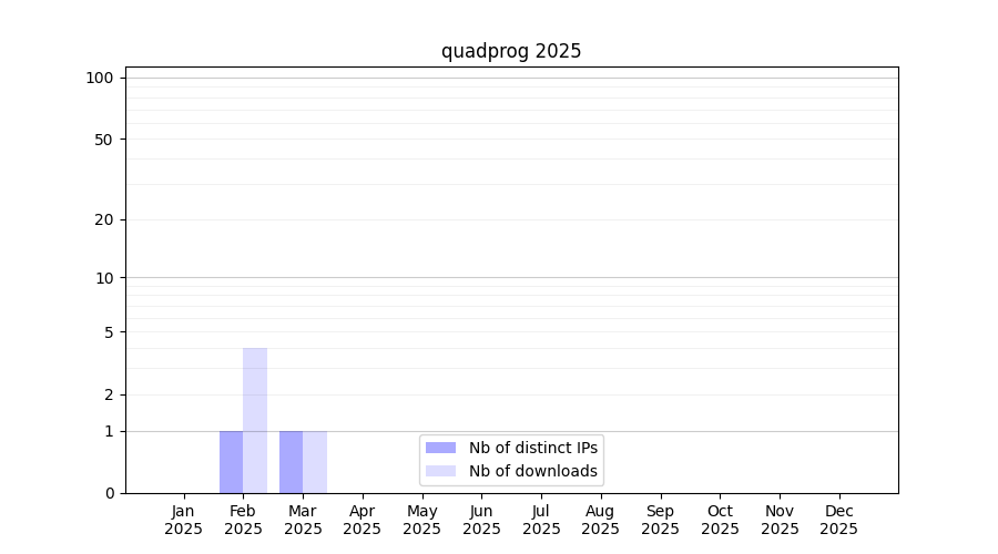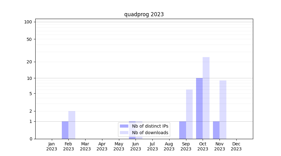 Number of downloads for experiment package quadprog, year by year, from 2025 back to 2014 (years with no downloads are omitted):