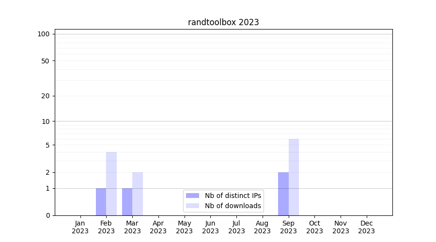 Number of downloads for experiment package randtoolbox, year by year, from 2025 back to 2014 (years with no downloads are omitted):