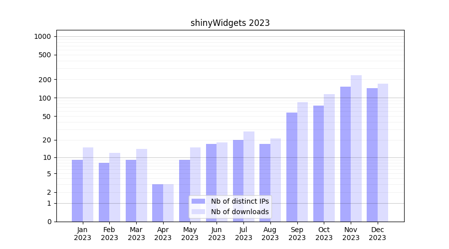 Number of downloads for experiment package shinyWidgets, year by year, from 2025 back to 2014 (years with no downloads are omitted):