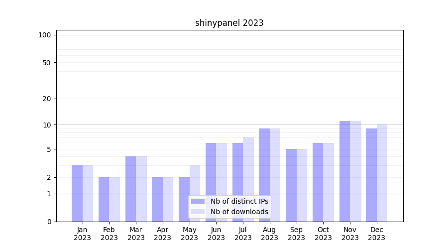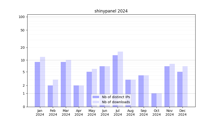 Number of downloads for experiment package shinypanel, year by year, from 2025 back to 2014 (years with no downloads are omitted):