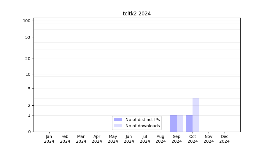 Number of downloads for experiment package tcltk2, year by year, from 2025 back to 2014 (years with no downloads are omitted):