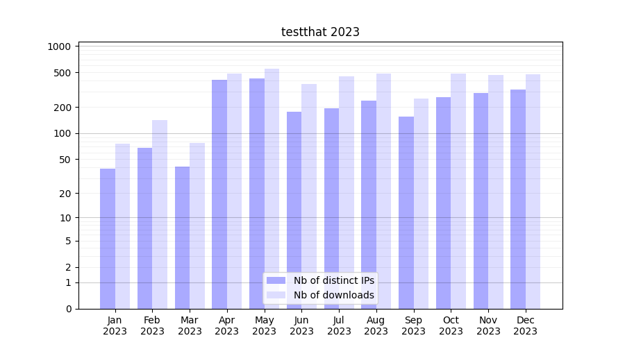 Number of downloads for experiment package testthat, year by year, from 2025 back to 2014 (years with no downloads are omitted):