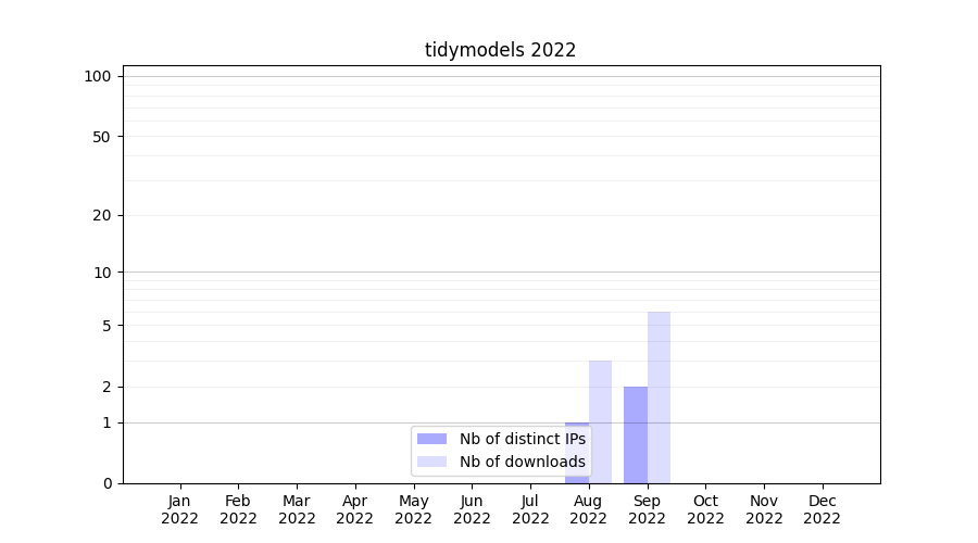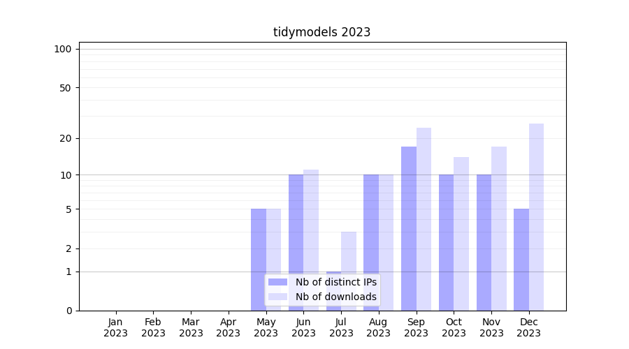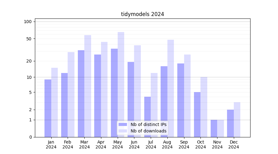 Number of downloads for experiment package tidymodels, year by year, from 2025 back to 2014 (years with no downloads are omitted):